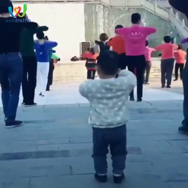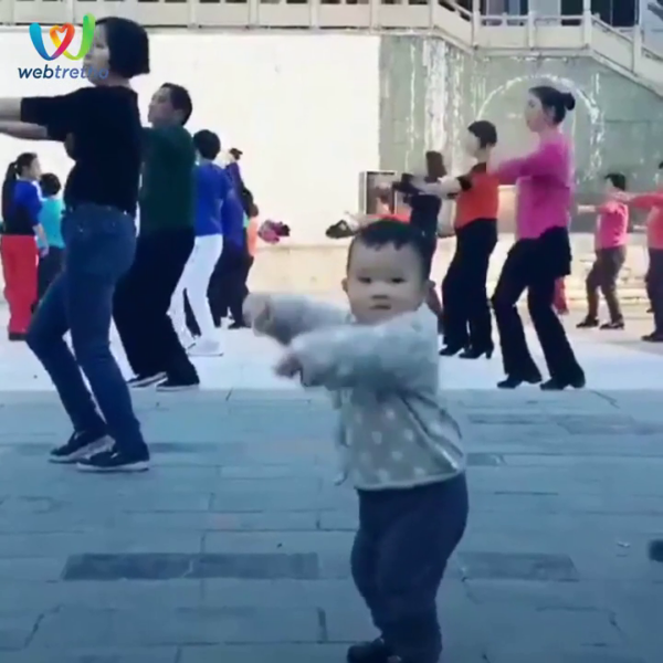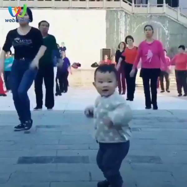 광장에서 스포츠 댄스를 추는 어른들 사이에 귀여운 아기가 있다.