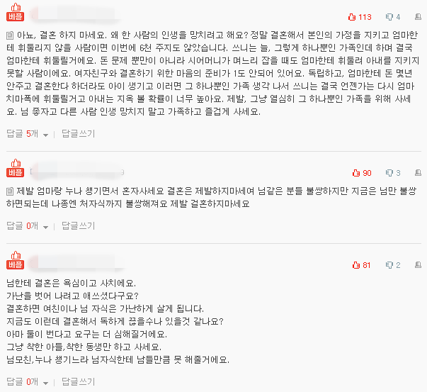이에 네티즌들은 그냥 “님네 어머니, 누나랑 행복하시길 바랍니다”, “결혼하지 마세요;;;”, “돈 6천만원이 당장 필요한 것도 아닌데 당장 달라고 하는 것도 너무 웃긴다 그걸 주는 사람이나 에혀 글렀네요” 등 다양한 반응을 보였다.
