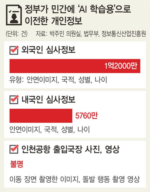 지난해 민간 업체들이 법무부로부터 받아 사용한 안면 데이터 중 외국인 정보는 1억 2천만 건이며, 내국인 출입국자들의 얼굴 사진 5760만 여건의 안면 데이터도 ‘인공지능 학습’에 사용되었다고 알려진다.