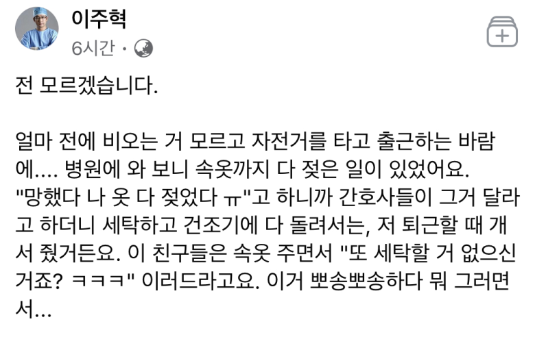 그는 “얼마 전에 비오는 거 모르고 자전거를 타고 출근하는 바람에, 병원에 와 보니 속옷까지 다 젖은 일이 있었다”고 운을 뗐다.