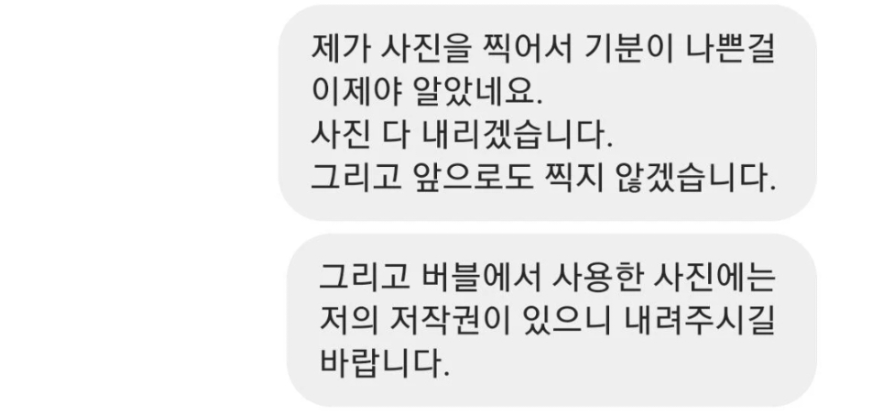버블에서 사용한 사진에는 저에게 저작권이 있으니 내려달라”고 항의했다고 한다.