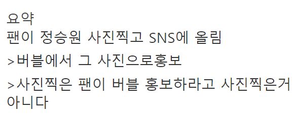 사진을 찍은 팬은 곧바로 업체와 정승원의 에이전시에 “버블 같은 유료 서비스 회사가 사용하도록 허락한 적이 없다. 허락도 없이 무단으로 사용한 사진에 대해 주중으로 모두 내려달라”고 문의했고, 정승원 측은 “‘사진을 사용하기 전에 물어봤어야 했다’라고 주장하기 전에 애초에 선수에게 허락 맡고 사진을 찍어야 한다.