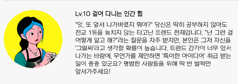 점수에 따라 1 레벨 ‘속세에 얽매이지 않는 자연인’부터9레벨 ‘모르는 게 없는 트렌드 봇짐러’, 10레벨 ‘걸어 다니는 인간 힙’까지 나눠져 있다.