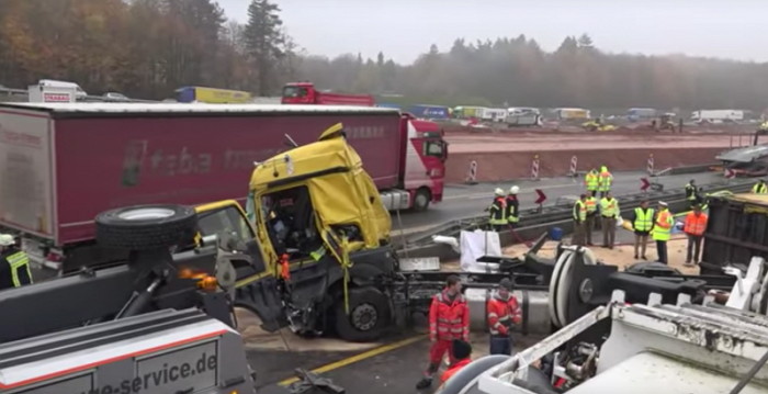 해당 사진은 지난 13일 독일의 한 고속도로에서 촬영된 것으로, 당시 대형트럭 추돌사고가 발생해 차량이 파손되거나 전복되는 등 도로 위가 매우 심각한 상황이었다.