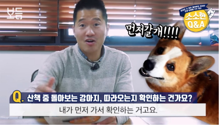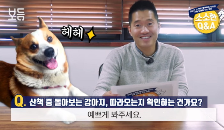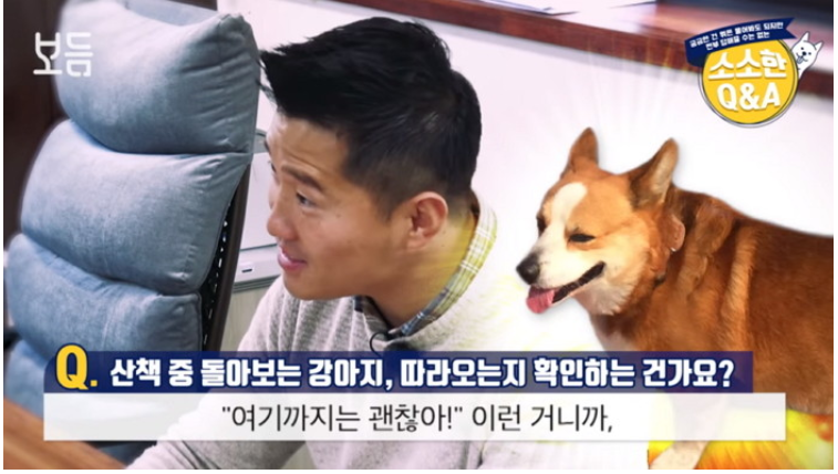 “산책 중에 앞서가던 강아지가 자꾸 돌아보는 행동은 제가 뒤따라가는지 확인하는 건가요?”라는 질문에 강형욱 동물조련사가 미소를 지으며 “네”라고 답변을 했다.