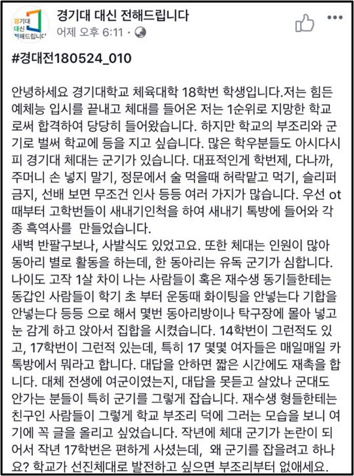 지난 24일 ‘경기대 대신 전해드립니다’ 페이스북 페이지에 경기대학교 체육대학 18학번 학생이 작성한 장문의 글이 게재됐다.