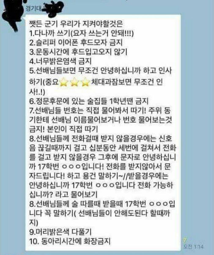 ‘다나까 쓰기’, ‘너무 밝은 염색 금지’부터 ‘선배님들을 보면 무조건 안녕하십니까 하고 인사하기’, ‘선배님 번호는 직접 물어서 따기’ 등 행동 강령이 담겨있었다.