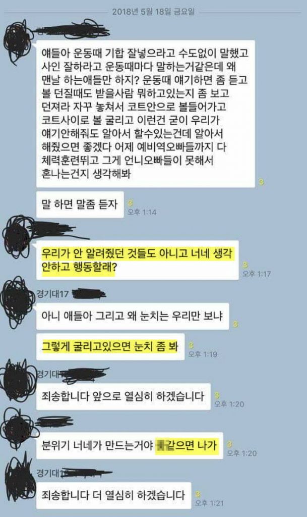 다른 선배들 역시 “우리가 안 알려줬던 것들도 아니고 생각 안 하고 행동할 거냐”, “분위기 너희가 만드는 거니 X 같으면 나가” 등의 협박성 발언도 이어갔다.