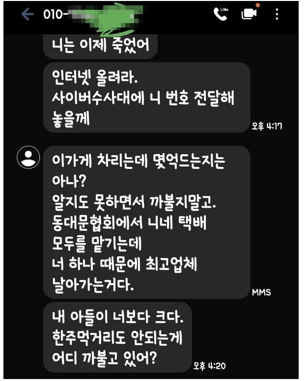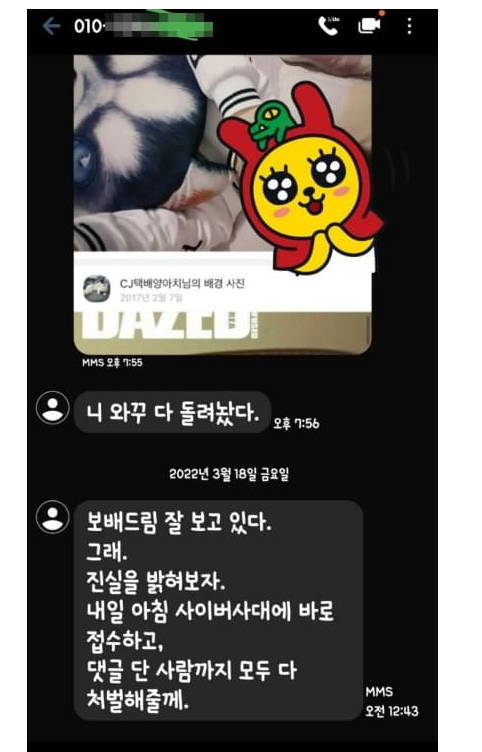 이후 18일 A씨에게 여사장의 문자 내용에 “니 얼굴 다 돌려놨다”, “그래 진실을 밝혀보자. 내일 아침 사이버수사대에 바로 접수하고 댓글 단 사람까지 모두 다 처벌해줄게”라 메세지가 왔다.