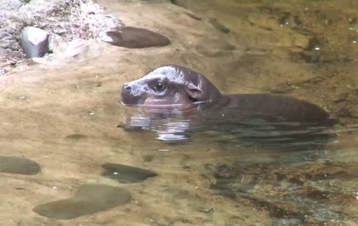 공개된 사진 속 아기 하마는 물에서 헤엄치다 말고 바깥으로 나와 자신을 보러 온 사람들을 구경한다.