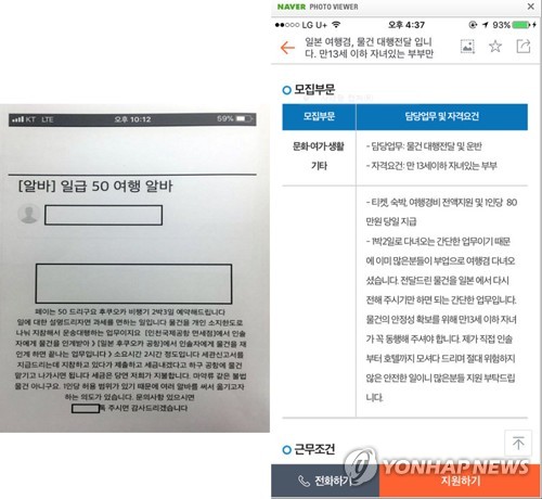 아르바이트생 모집 사이트에서는 ‘물건 대행 전달’이라며 일본행 항공료와 호텔 숙박비뿐 아니라 여행 경비로 80만∼100만원을 지급한다며 젊은층을 유인했다.