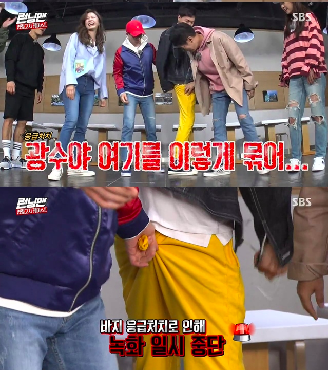 이광수의 바지 응급 처치 때문에 잠시 녹화는 중단됐고, 멤버들은 뒤를 묶어 ‘꼬리’가 생겨 버린 이광수의 바지를 보며 웃음을 참지 못했다.