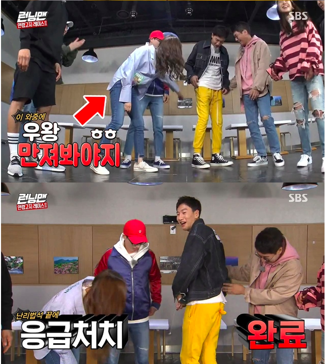 이광수는 어쩔 줄 몰라 하는 모습을 보였고, 유재석은 “광수야 이건 아니야. 진짜 손 많이 가는 스타일이네”라고 하며 이광수의 바지 뒤를 묶었다.