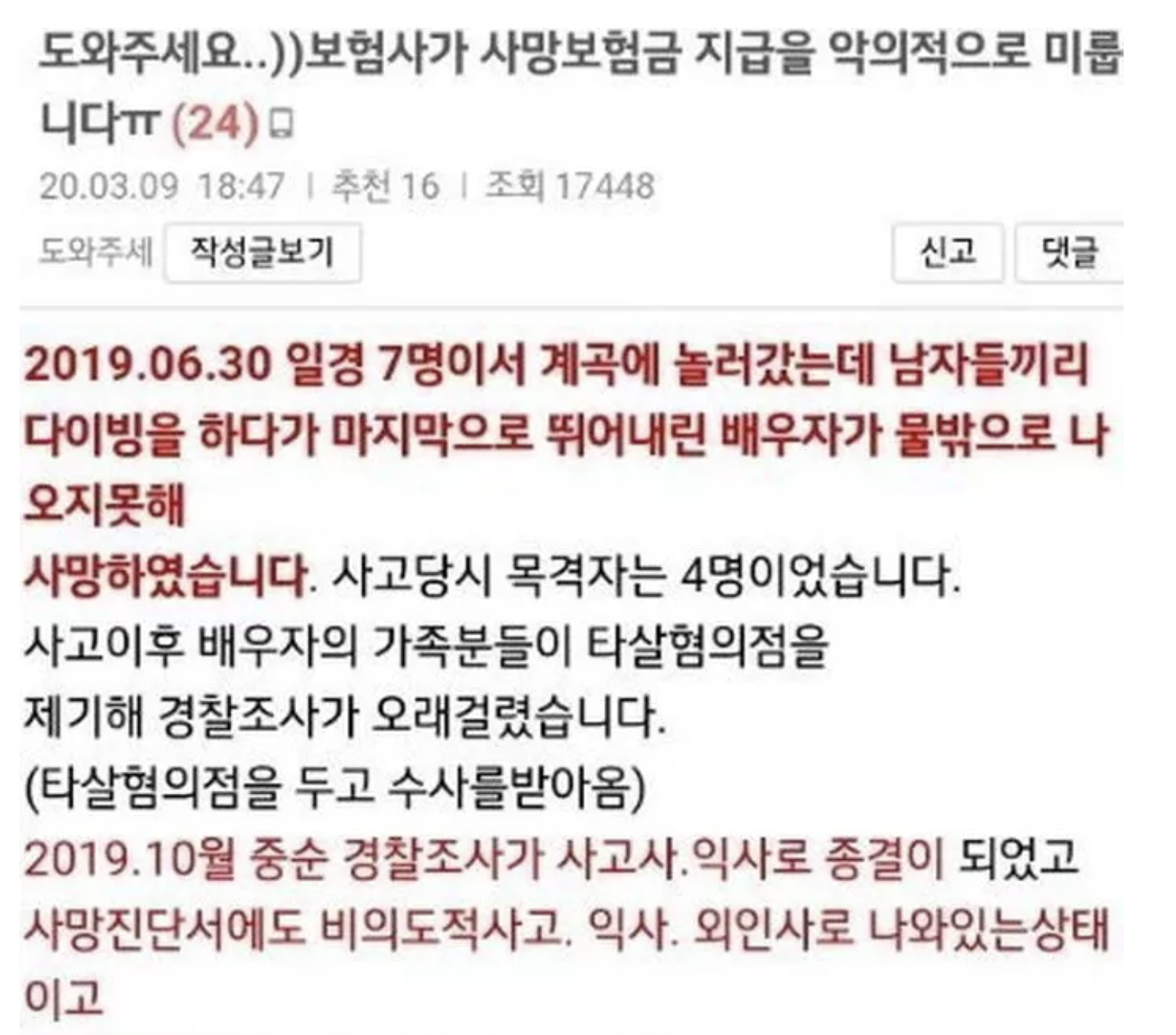 가평 계곡 남편 익사 사건 이후 보험금 안준다고 올렸던 용의자 아내의 소름돋는 글