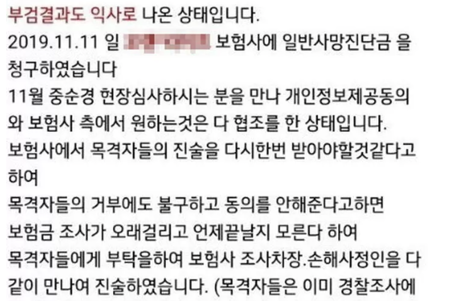 지난 2020년 이씨로 추정되는 인물은 한 온라인 커뮤니티에 ‘보험사가 사망보험금 지급을 악의적으로 미룬다’라는 제목의 글이 올라왔다.