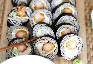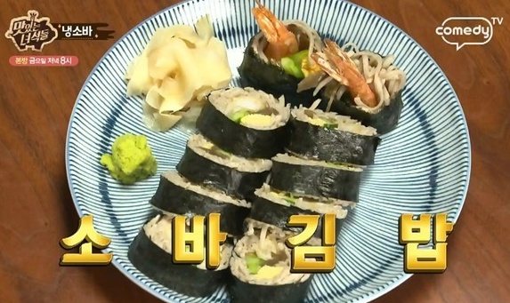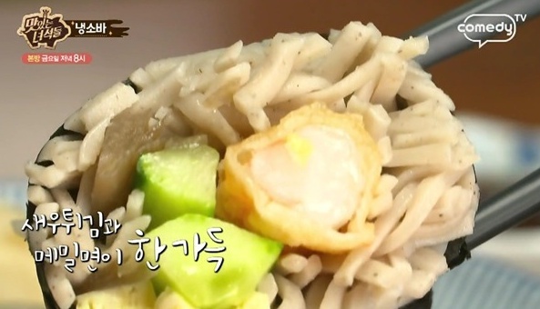 글쓴이는 “밥 대신 메밀변을 넣는 메밀 김밥”이라며 “햄 대신 새우튀김을 넣고 말아낸다”고 설명했다.