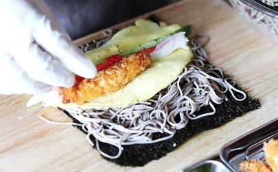 김밥김 위에 메밀면을 올리고, 지단-오이-크래미-새우튀김-와사비 마요소스 순으로 올린 후 말아주면 된다.