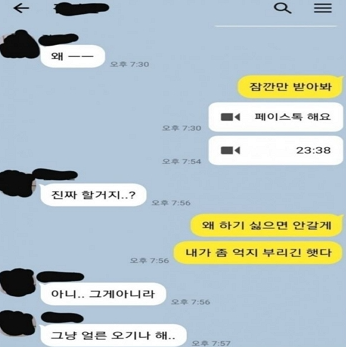 여성은 당황스러운 반응을 보였지만 갑자기 남성이 페이스톡을 보내더니 23분동안 어떤 행위를 했는지는 모르지만 갑자기 여성은 ‘진짜 할거지..?’라며 의미심장한 말을 던졌다.