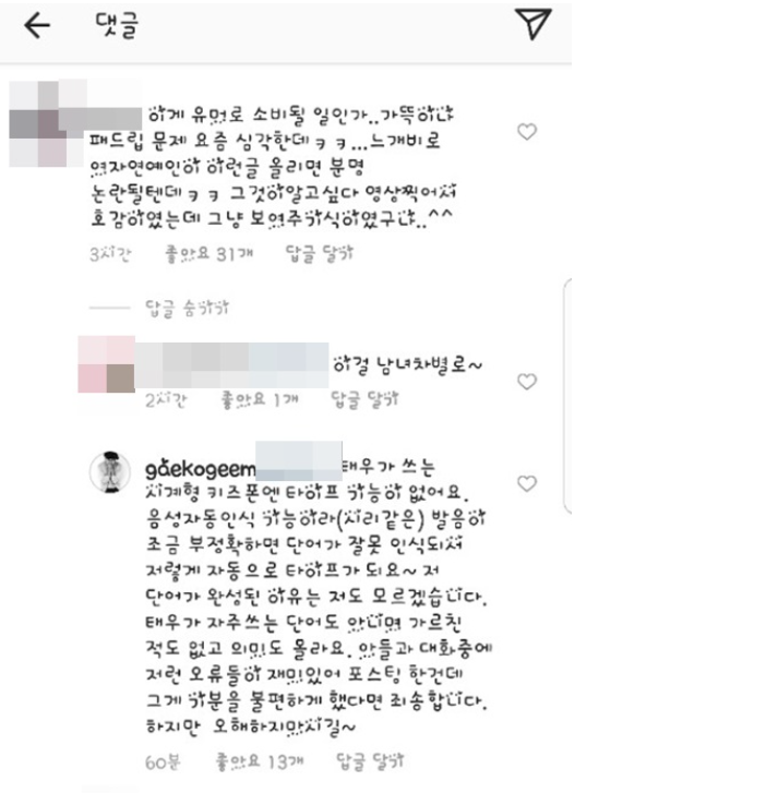 이에 개코는 “아들은 키즈폰을 사용하는데, 키즈폰에는 타이핑하는 기능이 없다. 음성 자동인식 기능으로 타이핑이 되는데, 발음이 확실히 안될때는 저렇게 나온다.”고 댓글로 해명했다.