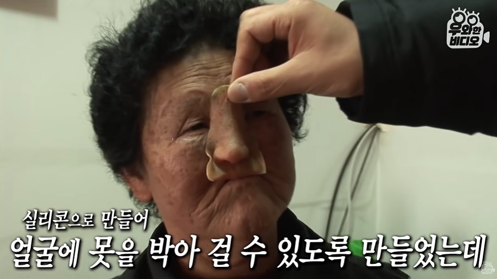 코를 갖고 싶었던 할머니는 10여 년 전 얼굴에 맞춰 만든 인조 코를 이마에 걸 수 있도록 제작했다고 말했다.