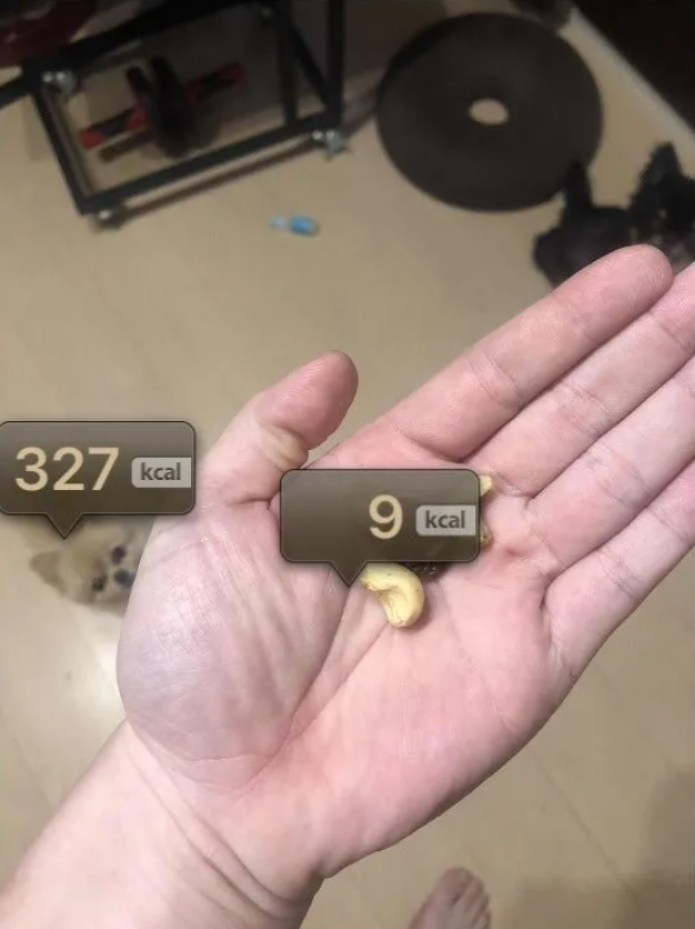 해당 어플을 사용한 어느 커뮤니티 네티즌은 자신의 손에 있는 견과류의 칼로리를 알고자 사진을 촬영했고, 결과를 보고 깜짝 놀랄 수 밖에 없었다.