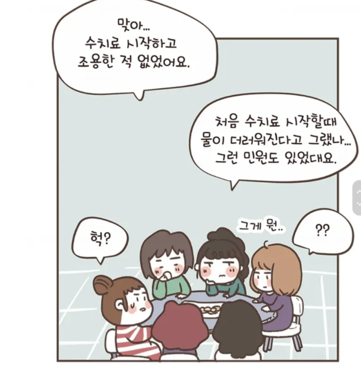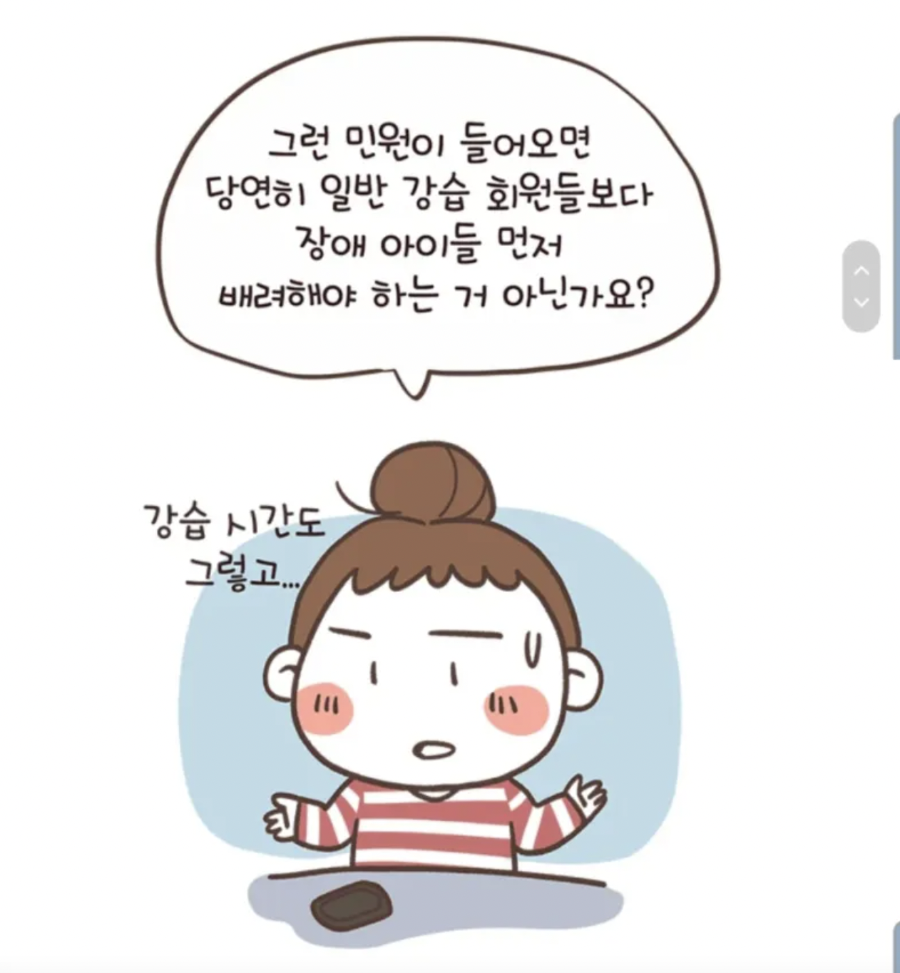 이에 학부모들은 고심이 깊어졌는데 매주 수치료 시간때마다 텃세 섞인 잔소리와 눈치를 주며 결국 해당 수치료를 폐지시키기까지 했다.