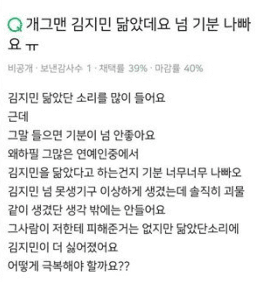해당 글을 작성한 글쓴이는 “김지민 닮았다는 소리를 많이 듣는다. 그런데 그 말 들으면 기분이 너무 안 좋다. 왜 하필 그 많은 연예인 중에서 김지민을 닮았다고 하는 건지. 기분 너무너무 나쁘다”라고 글을 남겼다.