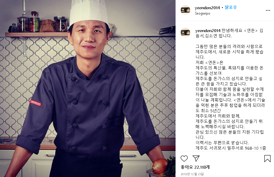 View this post on InstagramADVERTISEMENT 그동안 많은 분들의 격려와 사랑으로 제주도에서, 새로운 시작을 하게 됐습니다. 저희 <연돈>은 제주도의 특산물, 흑돼지를 이용한 돈가스를 선보여 제주도를 돈가스의 성지로 만들고 싶은 큰 꿈을 가지고 있습니다. 더불어 저희와 함께 꿈을 실현할 수제자를 모집해 기술과 노하우를 아낌없이 나눌 계획입니다.