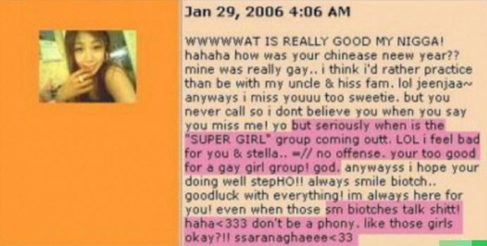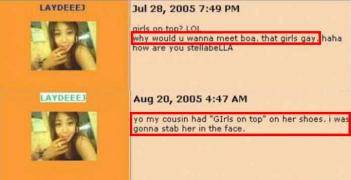 게다가, 보아를 좋아하는 자신의 친구에겐 “사촌이 내 신발에 걸스 온 탑이라고 적은 걸 보고 걜 칼(X)로 찌르고 싶었어”라 입에 담기 힘든 험담을 했다는 사실이 밝혀졌다.