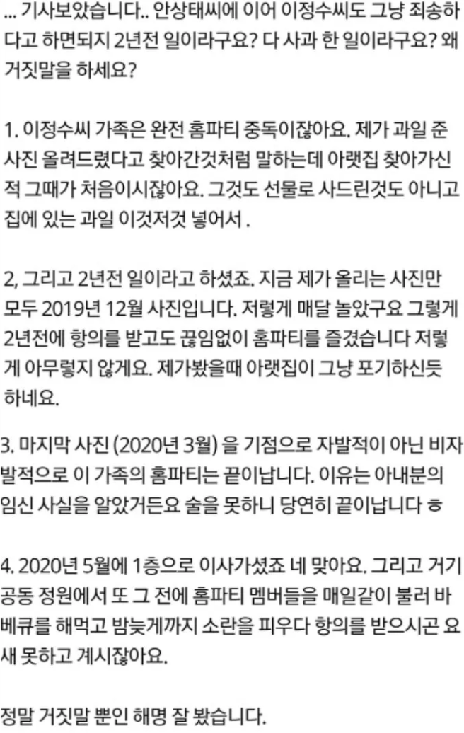 그는 이정수 가족이 홈파티 중독이라며 “제가 과일 사진 올려드렸다고 찾아간 것처럼 말하는 아랫집 찾아간 적 그때가 처음이시잖냐. 선물로 산 것도 아니고 집에 있는 과일 이것저것 넣어서”라고 비판했다.