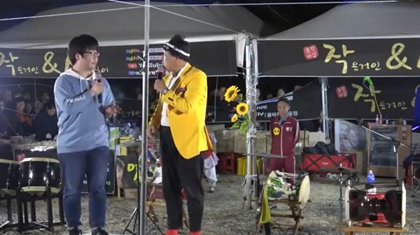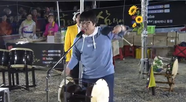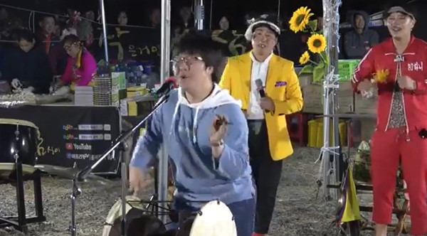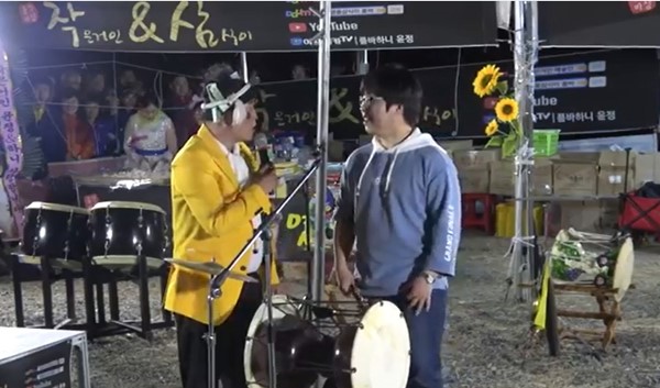 남학생이 흥겹게 리듬을 타며 장구를 치고 노래를 부르자 뒤에 서있던 사회자도 놀란 기색을 보였다.