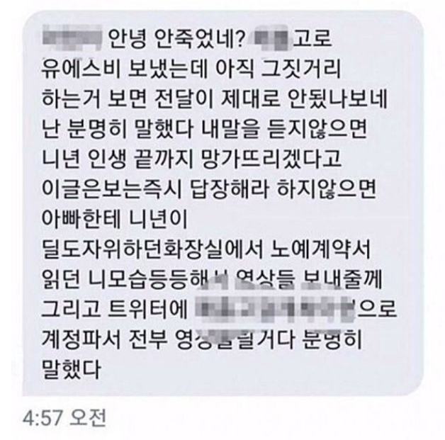 갓갓 문형욱은 피해자에게 “안녕 안죽었네? 내 말을 듣지 않으면 니X 화장실에서 노예계약서 읽던 영상들 아빠에게 보낸다”며 협박 문자를 보냈다.