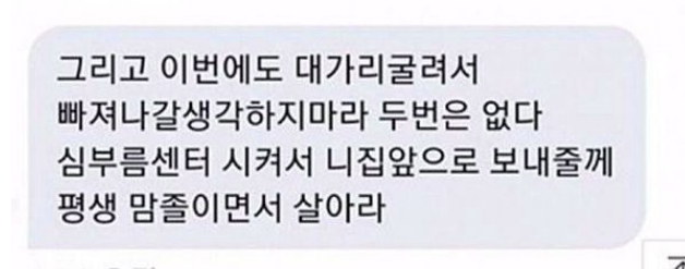 또 “이번에도 머리 굴려서 빠져나갈 생각 하지 마라, 두번은 없다”면서 “심부름센터 시켜서 니 집 앞으로 보내줄게 평생 맘 졸이면서 살아라”라고 한차례 더 문자를 보냈다.