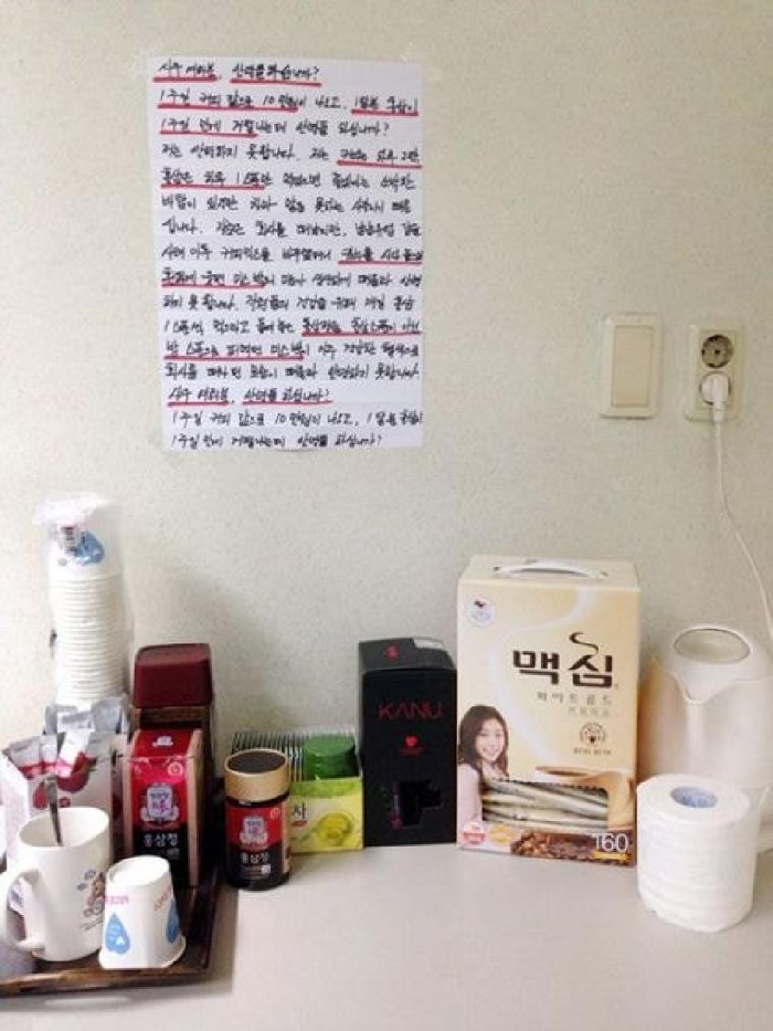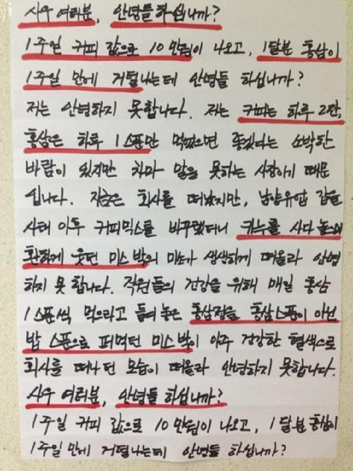 사장은 퇴사한 직원을 언급하기도 했다. 그는 “커피를 바꾸랬더니 카누를 사다 놓으면서 환하게 웃던 미스박의 미소가 생생하게 떠오른다. 홍삼정을 홍삼 스푼이 아닌 밥 스푼으로 퍼먹던 미스박이 아주 건강한 혈색으로 회사를 떠나던 모습이 떠올라 안녕하지 못합니다다”고 전했다.