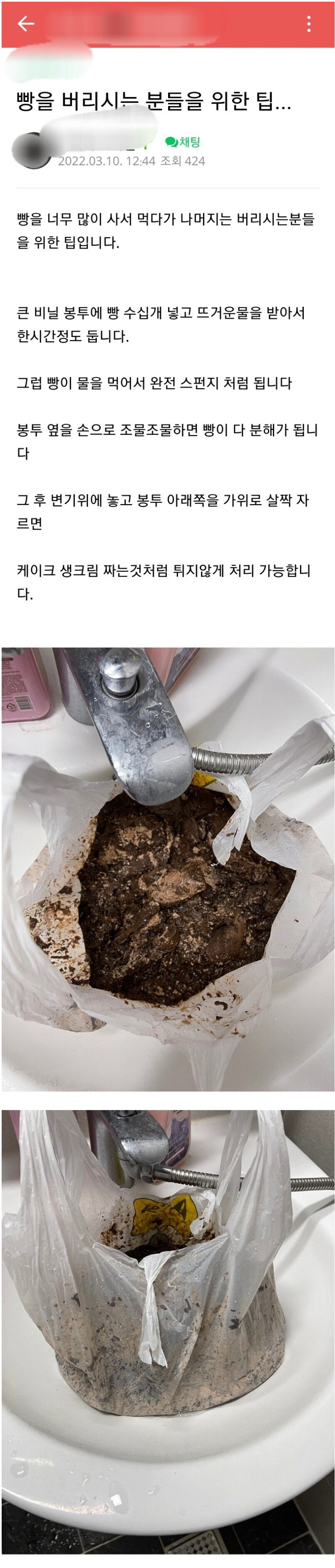 이어서 글쓴이는 “큰 봉투에 빵을 수십 개 넣고 뜨거운 물을 부어서 한 시간 정도 기다리면 빵이 쉽게 분해됩니다.”라고 말을 덧붙였다.