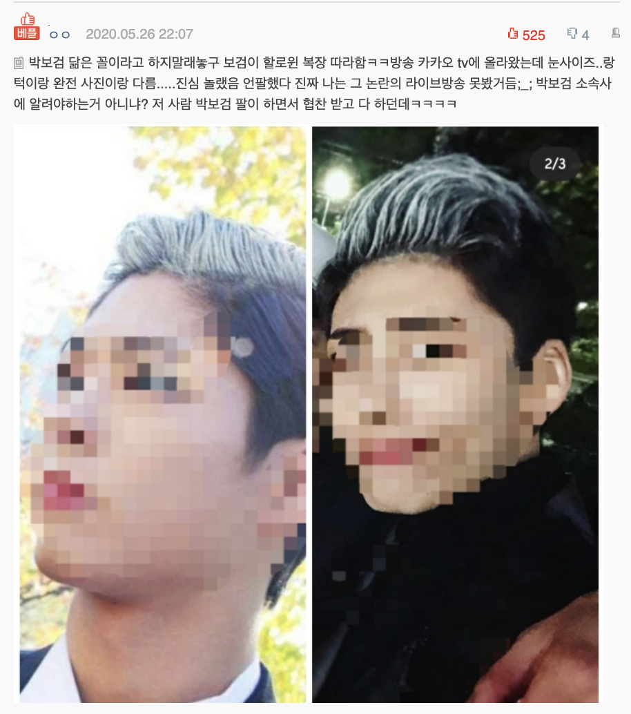 여러 온라인 커뮤니티에서는 “박보검 닮았다는 소리들어 스트레스 받는다며 방송에 나왔지만 평소엔 그런 소리 즐겨 듣는거 같다”, “박보검 닮은 꼴이라고 하지 말라해놓고 박보검 할로윈 복장 그대로 코스프레하더라”라며 그동안의 모습과 방송에서 나온 모습이 앞뒤가 다르다는 반응들이 많았다.