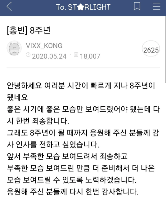 그는 지난 5월 24일 공식 카페에 8주년 기념글을 올렸다.
