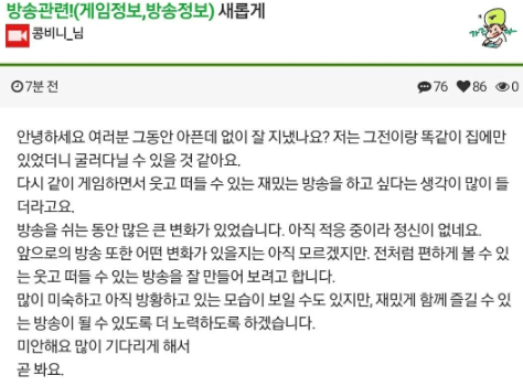 지난 6일 그는 자신의 트위치 게시판 ‘트게더’에 안부를 전하며 방송 복귀를 알렸다.