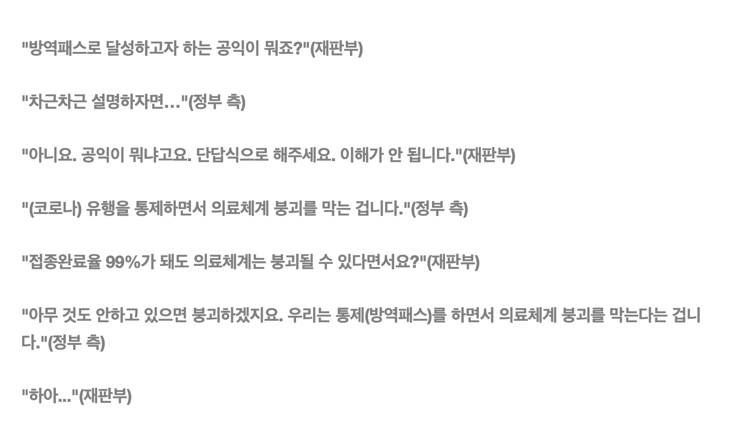 재판부는 또 의문이 생겼는지 “그럼 접종완료율 99%가 되면 의료체계는 붕괴 안 되나요?”라 묻자 정부 측은 즉각 “아닙니다. 예방접종만으로는 의료체계 붕괴를 막을 수 없습니다”라 답했다.