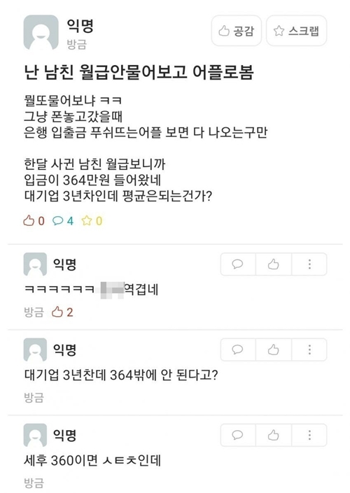 그러면서 “남자친구 임금이 364만원인데 대기업 3년차에 평균은 되냐?”고 어이없는 질문을 남기면서 더 큰 논란이 됐다.