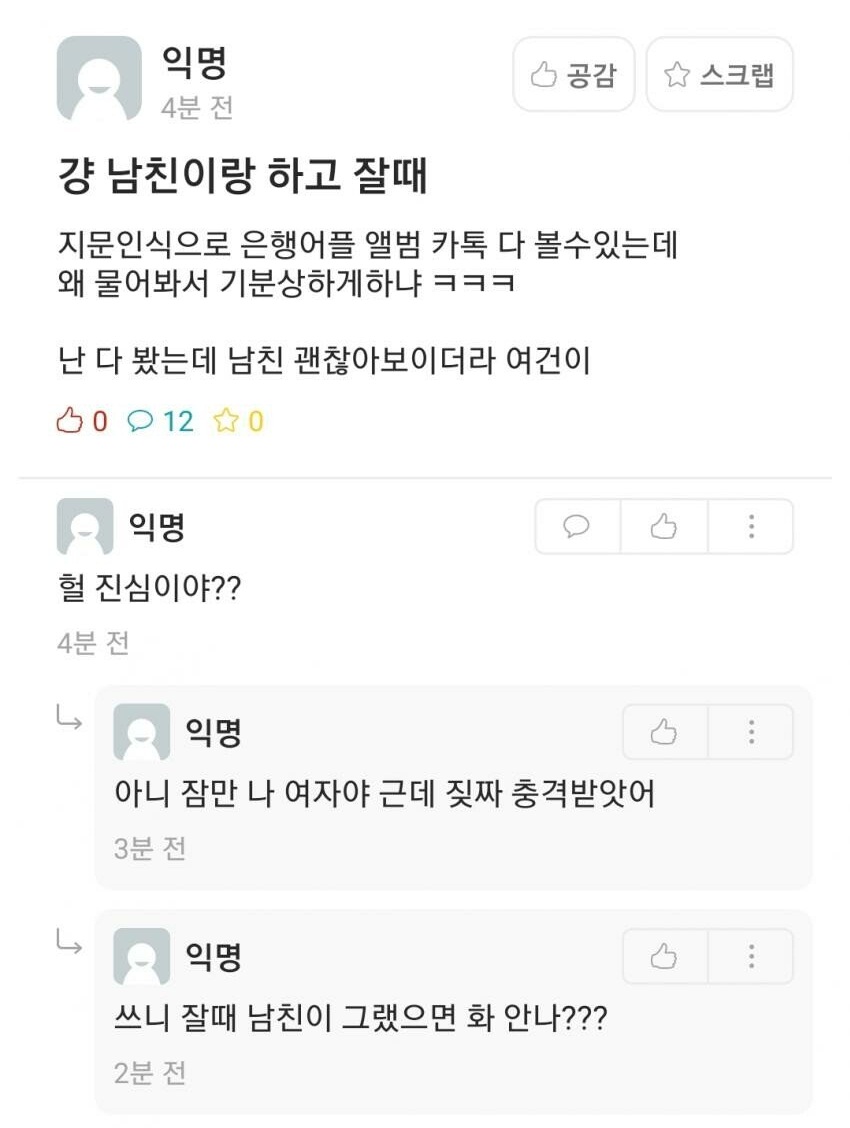 A씨 외에도 “남자친구 핸드폰에 지문인식으로 은행 앱 다 볼 수 있다”며 “난 (앱을 통해)다 봤는데 남친 여건이 괜찮아 보였다”고 말한 바 있다.