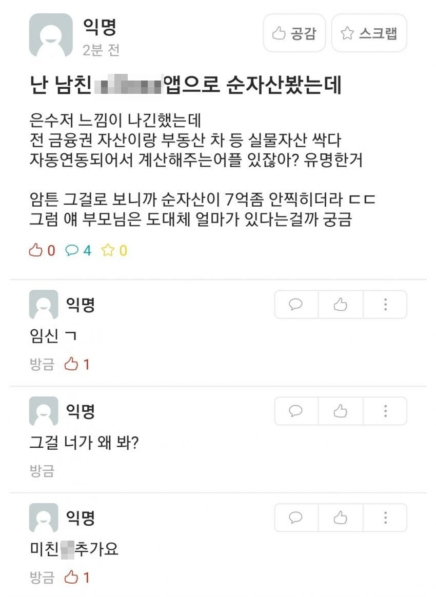 또 다른 누리꾼은 “앱으로 남자친구 자산을 봤는데 순 자산이 7억쯤 안 됐다”며 “그러면 남친 부모님은 얼마나 있는걸까”고 밝혔다.