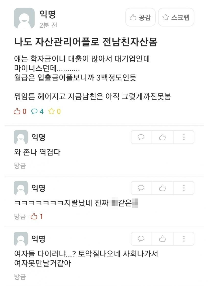 한편, 이를 접한 누리꾼들은 “쟤 남자친구가 이 글 봐서 작성자 처벌했으면 좋겠다”, “살다 살다 남의 재산을 왜 조회해? 어이가 없네”, “뭐 저런 사람이 다 있느냐?” 등 다양한 의견을 남기며 분노한 반응을 보였다.
