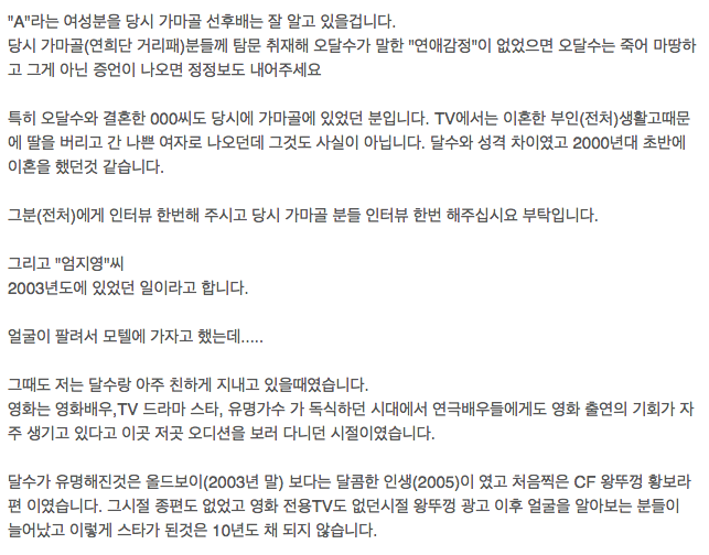 이어 “당시 가마골(연희단 거리패)분들께 탐문 취재를 해 오달수가 말한 ‘연애감정’이 없었으면 오달수는 죽어 마땅하고 그게 아닌 증언이 나오면 정정보도를 내어주세요”라며 호소했다.
