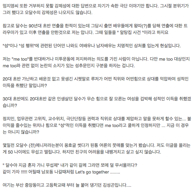 이에 대해 남성은 “(인터뷰에 나온) 엄지영씨 또한 거부하지 못할 강제성에 대한 답변으로 자기가 속한 극단 이야기만 한다”며 “그 시절 분위기가 그랬다고 말하고 오달수의 강제성에 대해서는 나오지도 않는다”라고 말하며 문제를 제기했다.