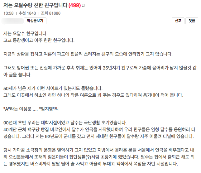 남성은 며칠 전 오달수의 전 매니저가 옹호 글을 올렸다 여론의 뭇매를 맞는 것을 보고 두려웠지만 “친구의 모습이 안타깝다. 진실에 가까운 후속보도가 필요하다”며 글을 올리는 목적을 다시 한번 상기시키고 마무리했다.