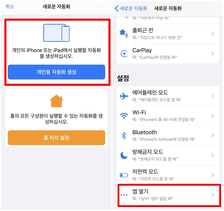 13.6으로 업데이트 된 아이폰이라면, ‘단축키 앱’에 들어가 두 번째 탭인 ‘자동화’로 들어가자. ‘개인용 자동화 생성’ 버튼을 눌러 새로운 자동화 리스트가 나오면 하단에 위치한 ‘앱 열기’를 선택한다.