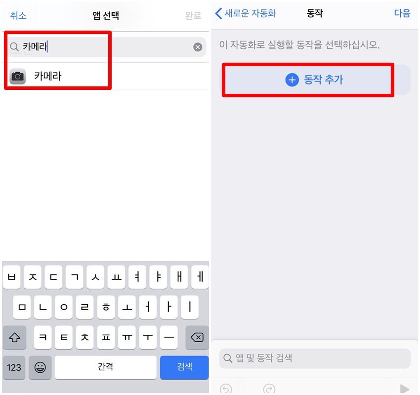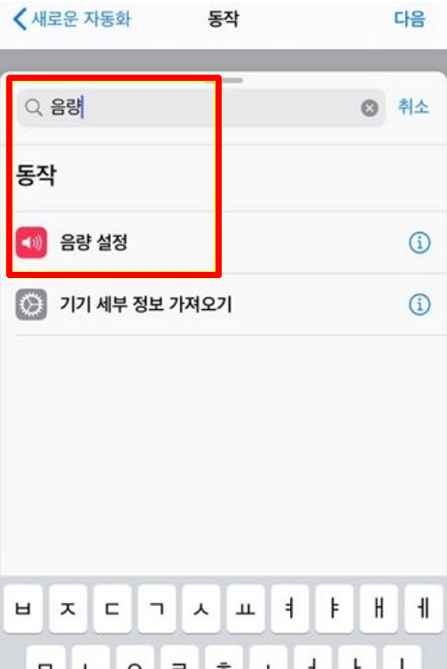 이후 ‘앱 열기’ 검색창에 ‘카메라’를 검색하고, ‘동작 추가’를 눌러 ‘음량 설정’을 검색해 추가한다.