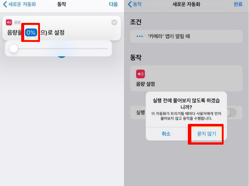 이후 우측 상단에 ‘다음’을 눌러 새로운 자동화 탭으로 넘어가면 된다. 마지막으로 ‘실행 전 묻기’를 비활성화로 전환하면 된다.