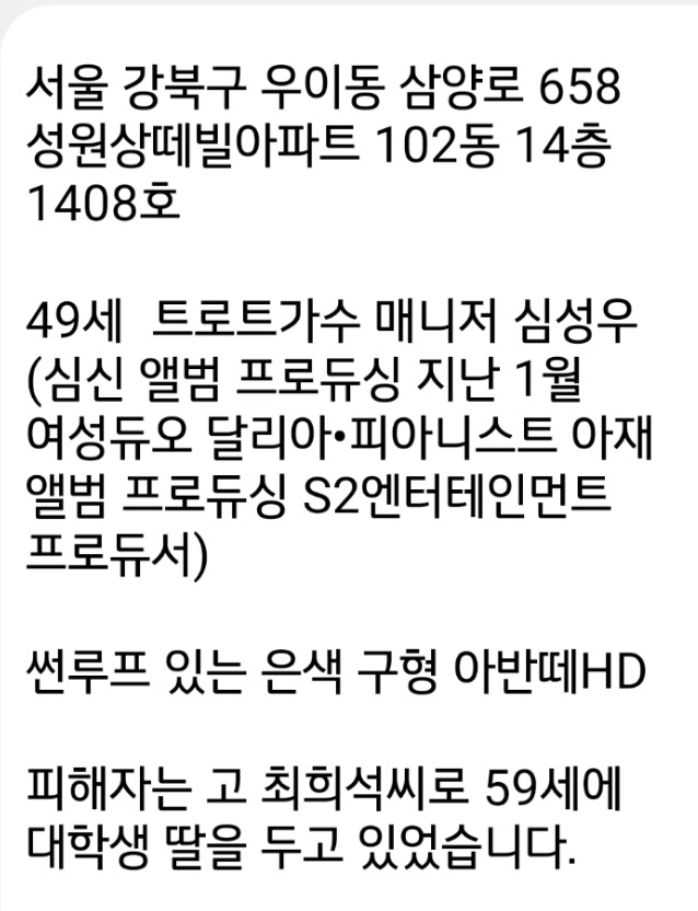 심성우씨는 트로트가수 ‘심신’의 매니저이자 프로듀서 작곡가로 활동했다고 한다.